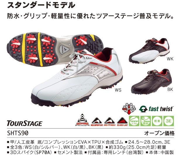 ★合計金額5,250円(税込)以上で送料無料★【2010年モデル】ブリヂストン TOUR STAGE(ツアーステージ) 飛びスパイクIII ゴルフシューズ SHV901【送料無料】 【smtb-MS】 価格: 19,950円 ※メーカー取り寄せ商品6つの左右非対称 ツアーステージ 飛びスパイクIII ゴルフシューズ 6つの左右非対称。 飛びスパイクに、新デザインが誕生! ■スペック■ 素材 甲/人工皮革 底/コンプレッションEVA×TPU サイズ 24.5?28.0cm、3E カラー WK(白/黒) 重さ 約420g(25.0cm片足) ●スパイラルグリップ(SP90T) ●セメント製法 ●付属品:交換用スパイク4個(台湾製)、専用レンチ(台湾製) ●本体:中国製 *「防水タイプ」テスト基準での耐水時間:24時間以上。 *この商品のソールは右打ち専用設計です。 *パワーガードインソール+採用 ※メーカー取り (更新日時:2010/10/28 08:34) Supported by 楽天ウェブサービス |